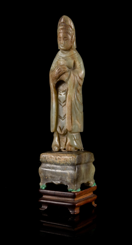 the deity depicted standing with hands clasped in front, dressed in long flowing robes, surmounted by a peaked headdress, the face with a calm expression, raised on a square stand decorated with an incised keyfret band, further raised on a hardwood stand.