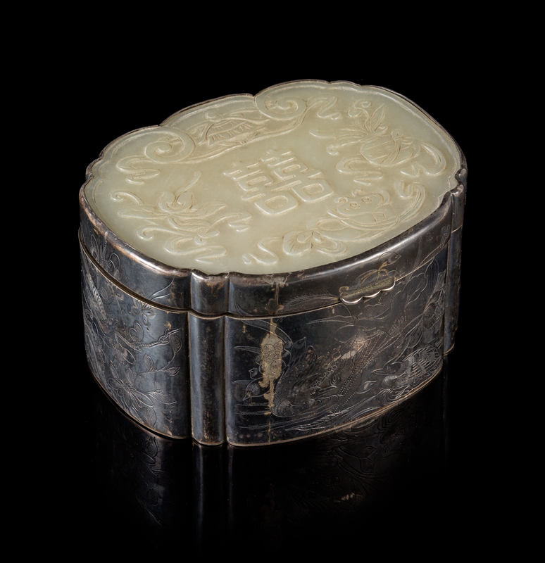 the plaque with a central double happiness symbol surrounded by flowering vines and a vase, the sides incised to depict birds amongst flowering branches and pomegranates, the inside of the cover with a mounted mirror.