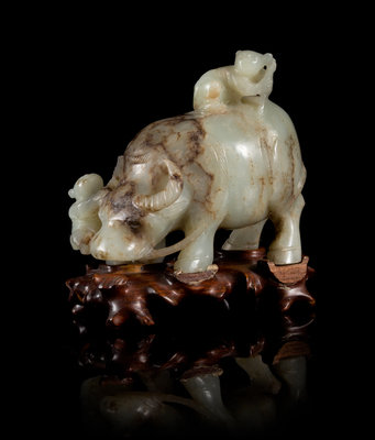 A Celadon Jade Figural Group of Boys and Buffalo