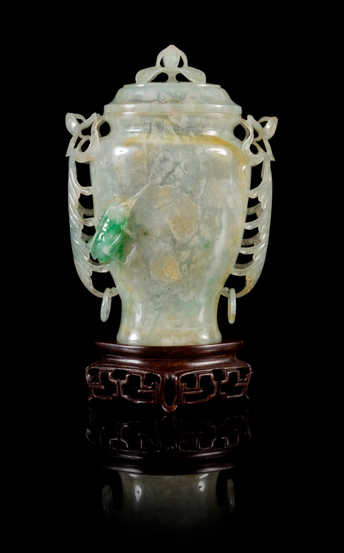 of a transparent stone with white inclusions, the thin sides crisply carved in high relief with a pair of foliage-form handles suspending loose rings, carved to the apple green skin highlighting a grasshopper, the domed oval cover surmounted by a flori-form finial, raised on a fitted hardwood stand with openworked decoration.