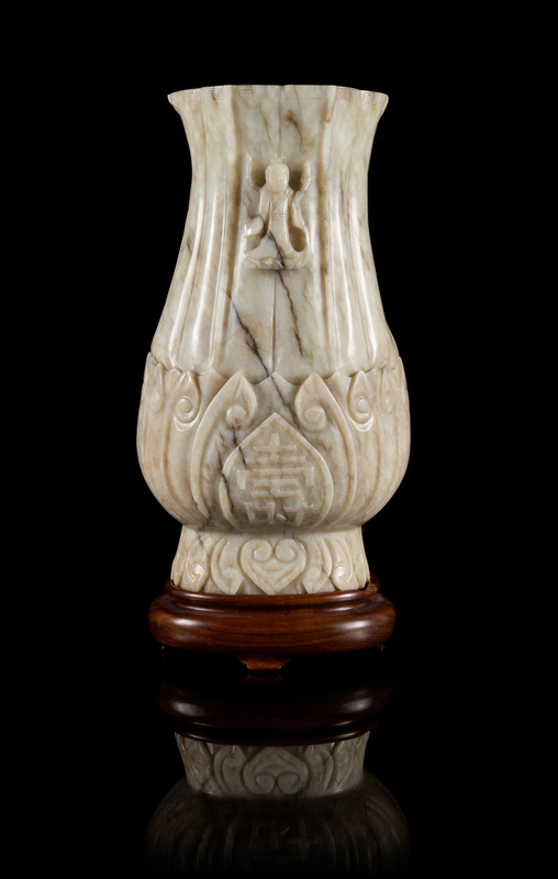 the stone of a creamy tone dark streaks and white inclusions, the pear shaped body carved with lobed outlines rising from a circular tall foot surmounted by a slightly flared flori-form mouth decorated with a keyfret band, the shoulders with two immortal figures carved in high relief, above two peach-form shou panels enclosed by overlapping lotus leaves with lingzhi sprigs to the sides, the base with similar lotus leaf motif, raised on a fitted hardwood stand.