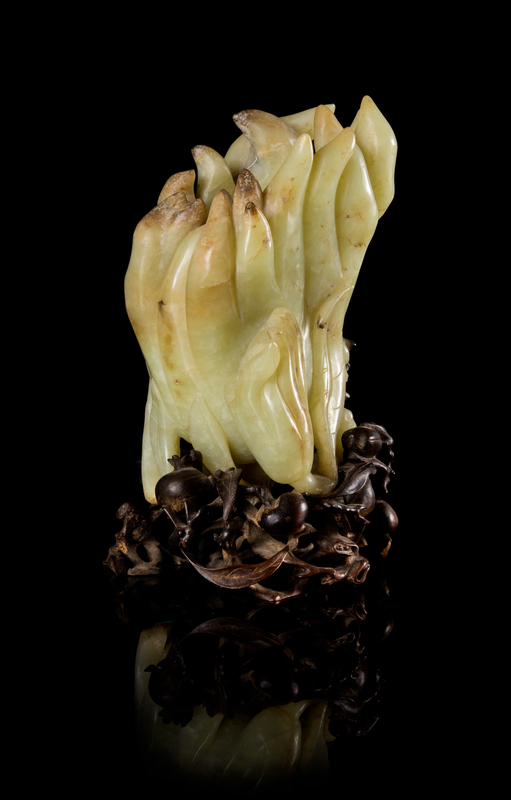 of a yellowish green stone with dark russet patches and minor white inclusions, naturalistically carved in the shape of a finger citron with curling leaves, rising from a leafy branch with smaller citrons forming the base, further raised on a fitted openworked stand carved with gnarled stems with finger citrons, pomegranates and peaches.