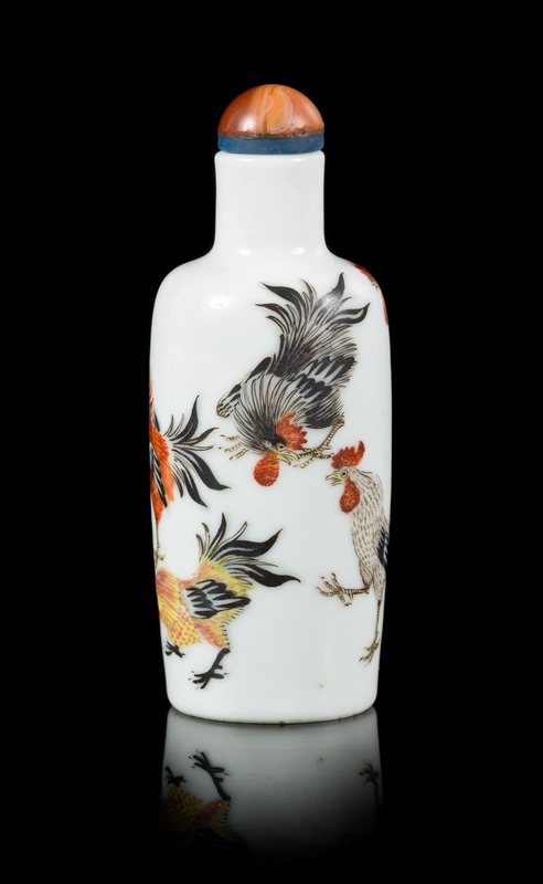 of small baluster form, painted to depict seven roosters, the underside bearing an apocryphal Yongzheng six-character mark in underglaze blue, having a banded agate stopper.