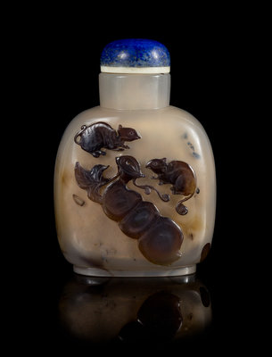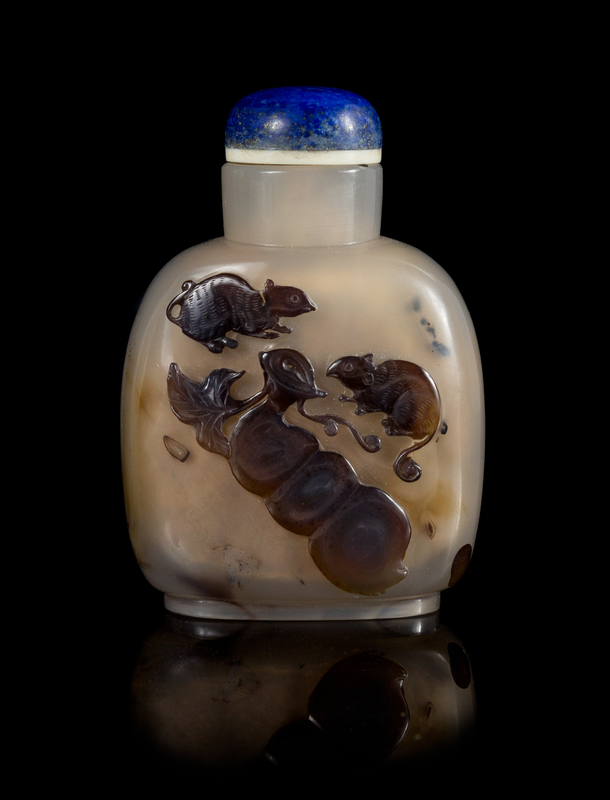 of flattened form, raised on a short oval foot, surmounted by a straight neck, the front carved to depict two squirrels and a bean pod, having a lapis lazuli stopper.