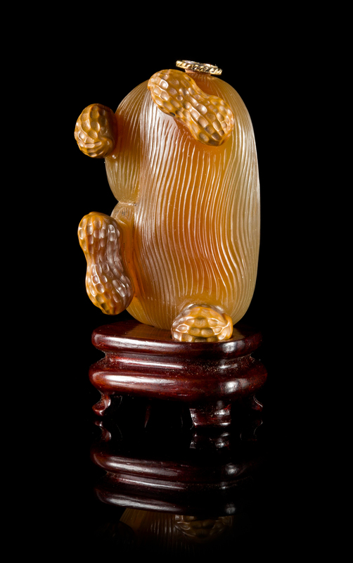 of ovoid form, the bottom flattened to form a foot, the body carved with veined texture, with four peanuts carved in sharp relief and painted, having a gilt metal stopper.