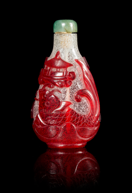 of pear shape, carved in relief depicting a carp in a lotus pond underneath a pavilion.