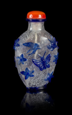of rounded form, raised on a short oval foot, carved though the blue overlay to the translucent, snowflake ground, decorated with butterflies and flowers.