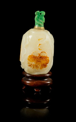of an even translucent white stone, of melon form with leaves, carved to the russet skins highlighting a butterfly, having a jadeite and gilt stopper, raised on a fitted hardwood stand.