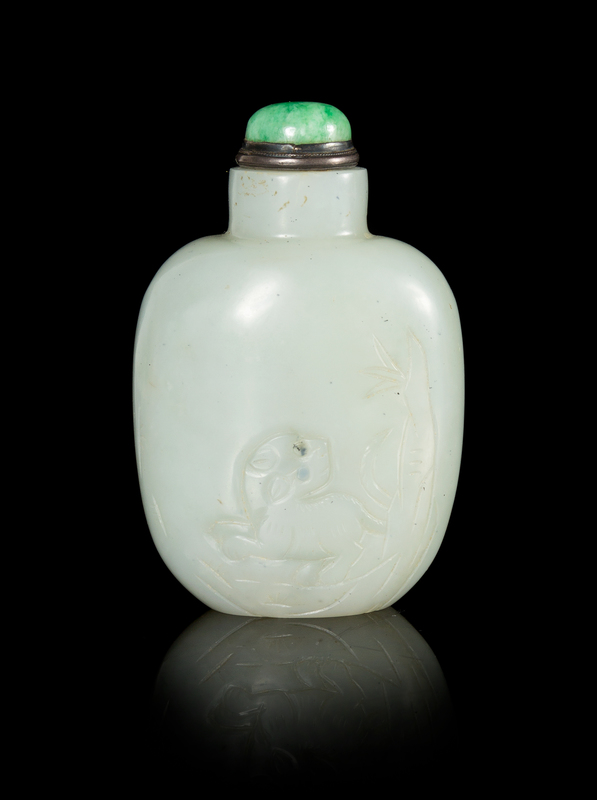 of flattened form with a flat foot, carved to depict a lion in a landscape, having a jadeite stopper.