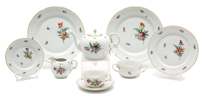 Pattern #865, with floral bouquets and sprigs, comprising 11 dinner, plates, 14 salad plates, 12 bread and butter plates, 8 handled soup bowls, 9 teacups, 16 saucers, 1 small round dish, 1 teapot and 1 creamer; 73 items total.