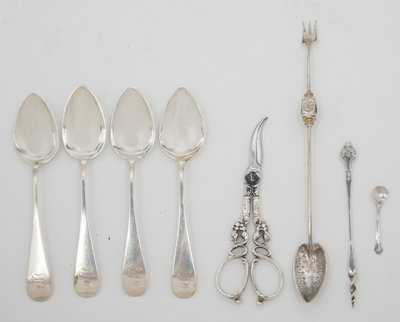 comprising:4 Ormsby & Gray coin silver spoons1 pair of sterling handled grape shears1 Gorham sterling spoon/fork combination1 sterling salt spoon1 Webster olive pick8 items total
