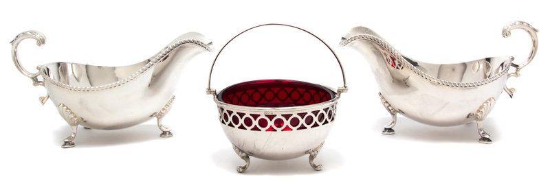 comprising a pair of footed sauce boats and a footed bowl with red glass liner.