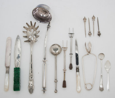 comprising:1 ladle1 pasta spoon1 ice pick1 tea strainer5 teaspoons 2 letter openers2 push-forks5 Stoli appetizer picks6 mother-of-pearl handled fruit knives24 items total
