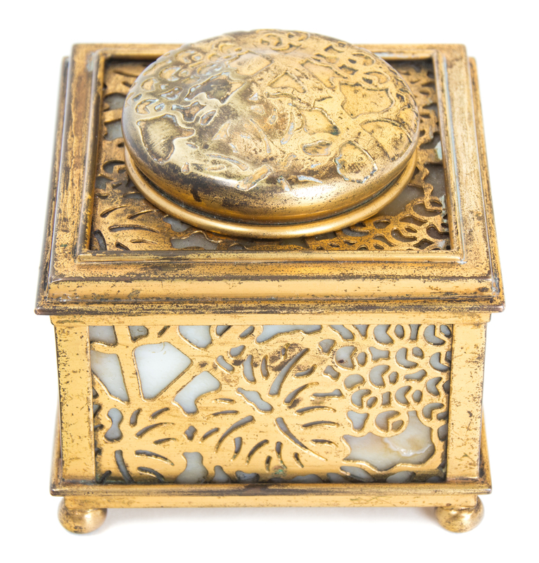 A Tiffany Studios Gilt Bronze and Slag Glass Inkwell