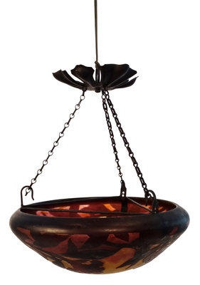 having a carved cameo plafonnier style light bowl with plum/purple floral and vine decoration on yellow ground, together with original metal ceiling mount and three chains. Signed Daum Nancy with the Cross of Lorraine.