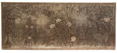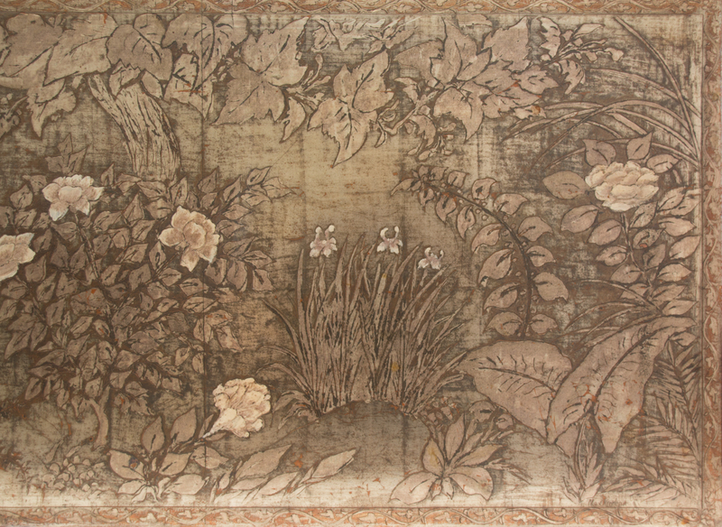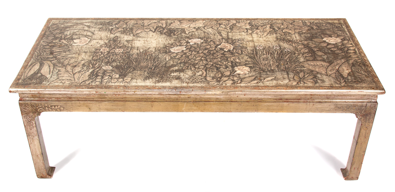 having a rubbed gilt finish with incised floral decoration, signed Max Kuehne on the table top (lower right).