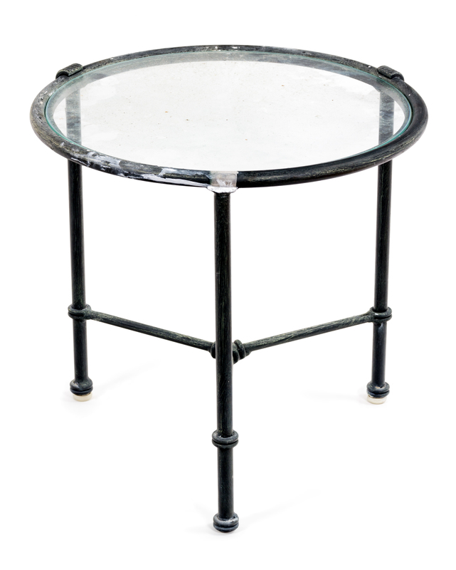 having a glass top raised on three legs connected by stretcher bars.