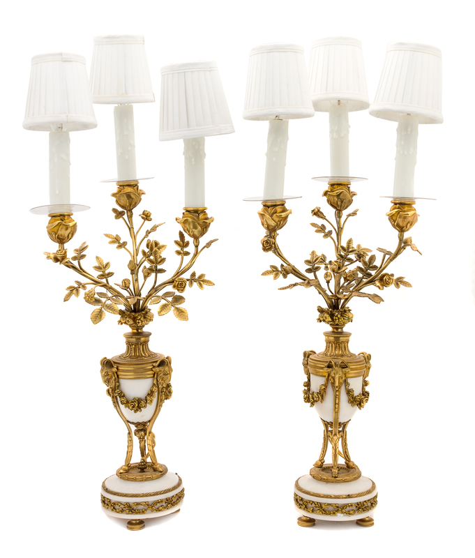 A Pair of Louis XVI Style Gilt Bronze Mounted Marble Three-Light Candelabra