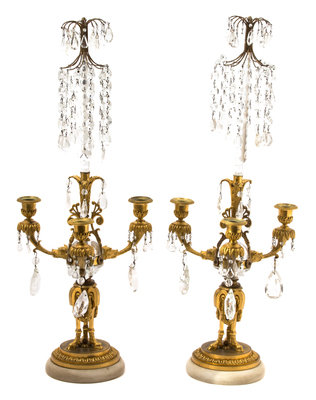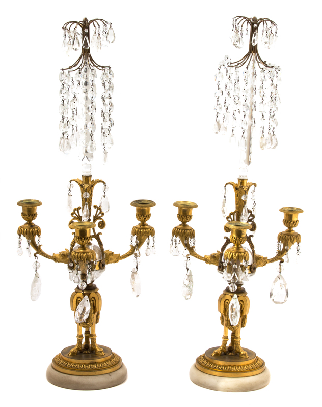 A Pair of Louis XVI Style Gilt Bronze and Cut Crystal Three-Light Candelabra