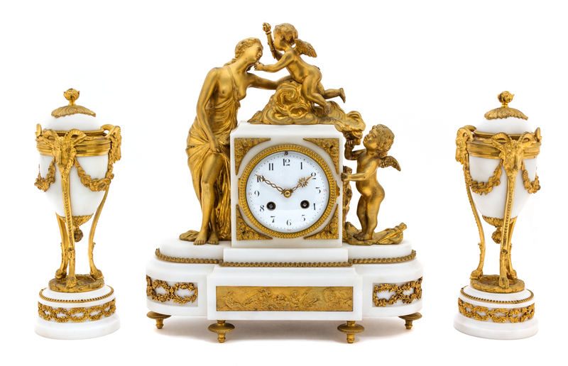 A Louis XVI Style Gilt Bronze Mounted Marble Clock Garniture