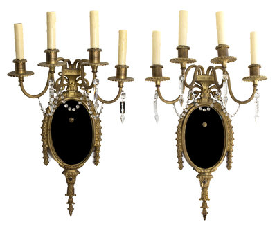 A Pair of Louis XVI Style Gilt Bronze and Beaded Crystal Four-Light Wall Sconces