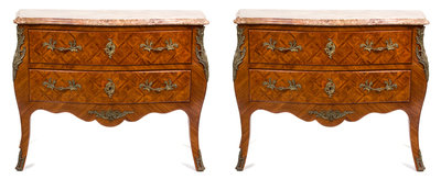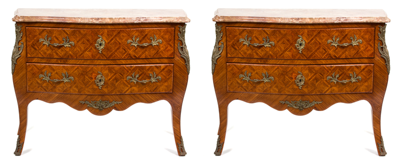 A Pair of Louis XVI Style Marquetry Bombe Commodes