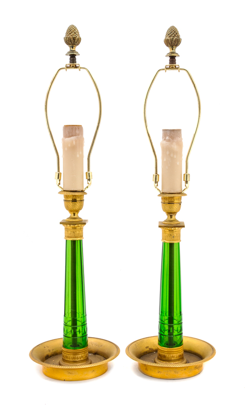 A Pair of French Empire Style Gilt Bronze Mounted Glass Candlesticks