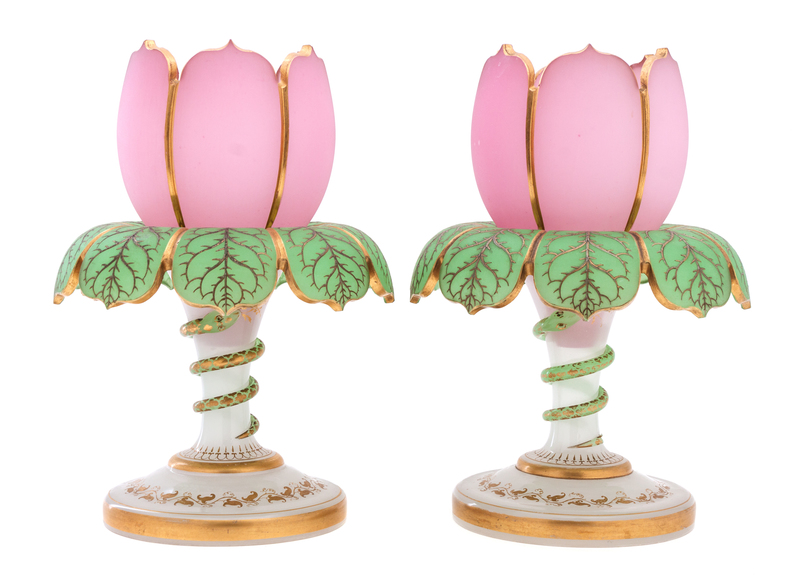 the pink and gilt tulip form inserts above green leaf bobeches and applied snake standards.