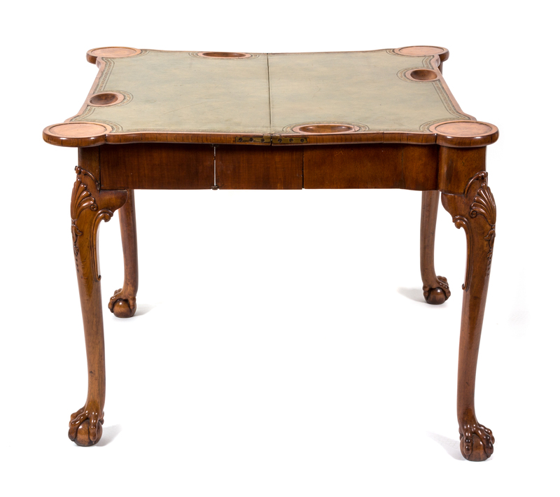 having a green and gilt tooled leather players surface with porringer corners and wells.