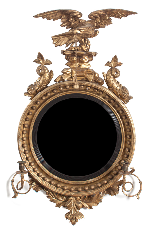 having a carved spread winged eagle on rockwork, flanked by stylized dolphins, curved girondole arms issuing from foliate pendant.