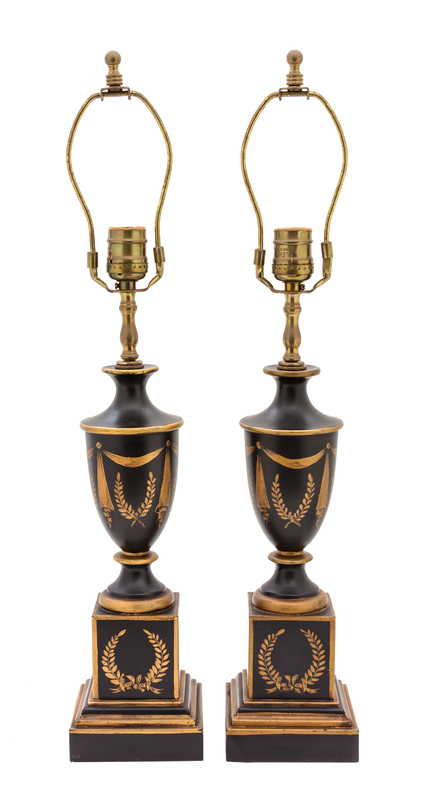 A Pair of Regency Style Gilt Decorated Tole Lamps