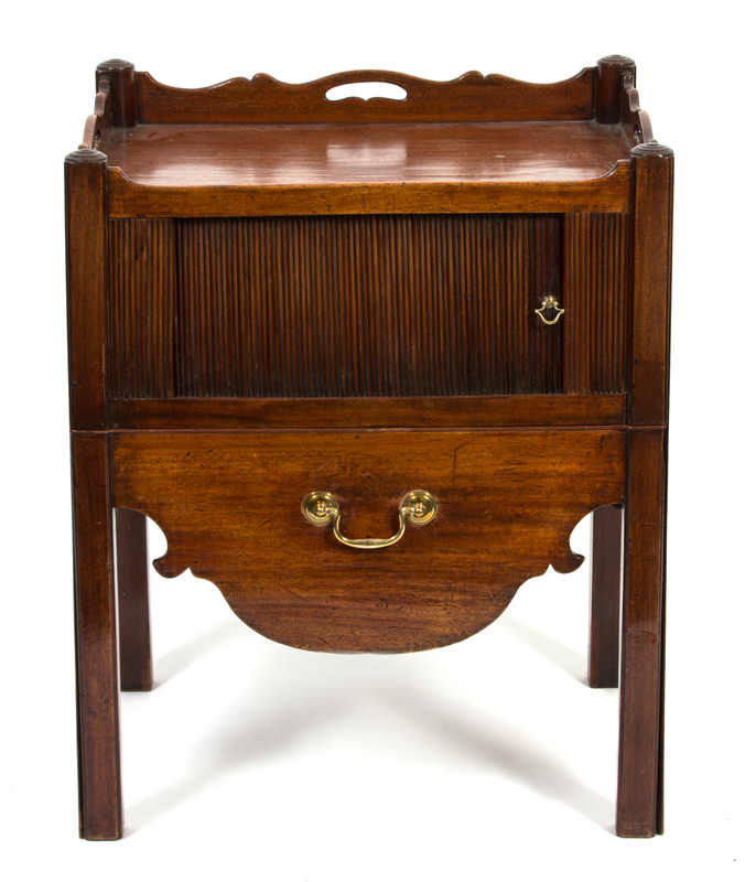 having a gallery top over a tambour sliding door, raised on straight legs.