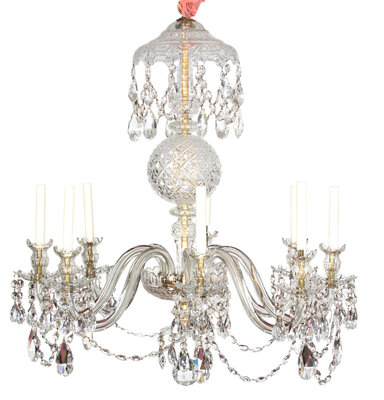 having eight scrolled arms hung with faceted prisms and beaded swags.