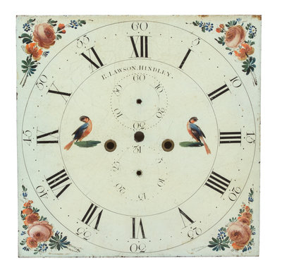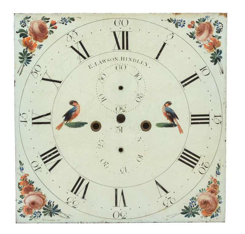 comprising a moon phase chapter ring, a square face signed E. Lawson, Hindley, and a domed face signed James Jefford, Wigton having a painted scene of a riverside estate.