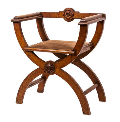 An English Arts & Crafts Carved Oak Savanarola Chair