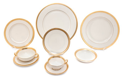 "Westchester" service, having gilt borders and an ivory ground, comprising 14 dinner plates, 14 luncheon plates, 29 salad plates, 13 side plates, 13 bread and butter plates, 14 shallow bowls, 13 bouillons, 14 teacups and 14 saucers; 110 items total.