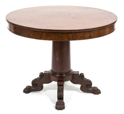 having a circular top over a tapered column, raised on acanthus carved legs ending in paw feet.
