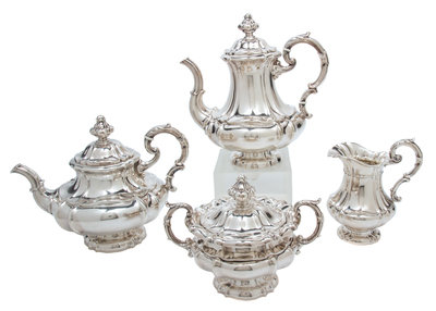 comprising a coffee pot, a teapot, a creamer and a covered sugar with gilt wash interior.