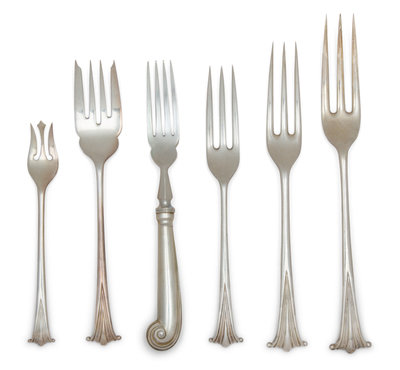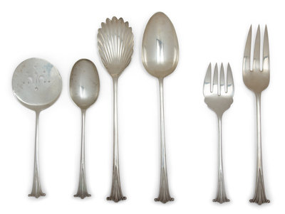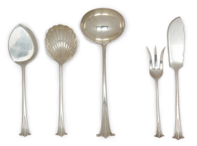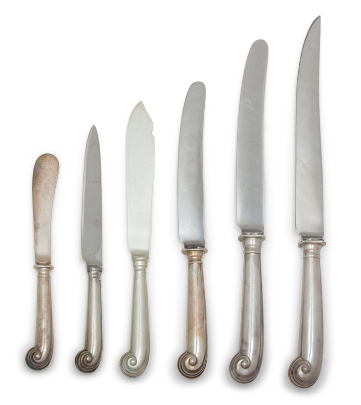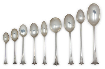 Wallace Sterling Company and CJ Vander Onslow pattern, comprising:12 steak knives12 table knives12 cheese knives12 tea knives12 fish knives12 butter spreaders12 table forks12 lunch forks12 salad forks12 dessert forks12 fish forks12 oyster forks12 table spoons12 soup spoons12 coffee spoons12 teaspoons12 iced teaspoons12 dessert spoons12 grapefruit spoons12 ice spades1 pair of meat carvers 1 pie server1 cake knife2 serving spoons1 serving fork1 pair of salad servers1 butter knife 1 sugar spoon 1 lemon fork1 flat server1 sauce ladle1 gravy ladle2 cold meat forks1 steel1 cheese serving knife1 jelly spoon