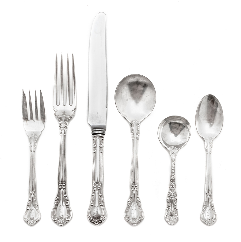 Chantilly Monogrammed pattern, comprising:11 dinner knives12 dinner forks12 salad forks12 cream soup spoons23 teaspoonstogether with 4 Gorham silver berry spoons.