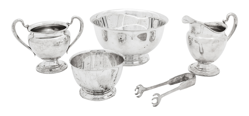 comprising a Gorham Revere style bowl, a Webster diminutive Revere style bowl, an International creamer and open sugar and a pair of Gorham sugar tongs.