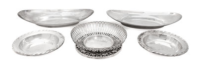comprising two Gorham oval trays, two Towle berry bowls, a Wallace reticulated bowl, and a Webster sterling mounted glass trivet.