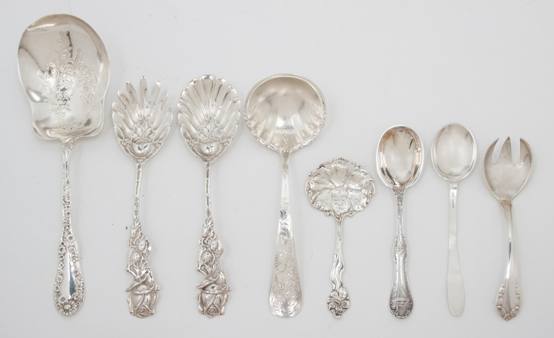 comprising 1 Dominick & Haff serving spoon, 1 shell form spoon with rose handle, 1 shell form fork with rose handle, 1 Gorham sauce ladle, 1 Tiffany & Co. New York spoon, 1 Georg Jensen child's fork, 1 George W. Shiebler & Co. floral spoon, and 1 unidentified maker spoon.