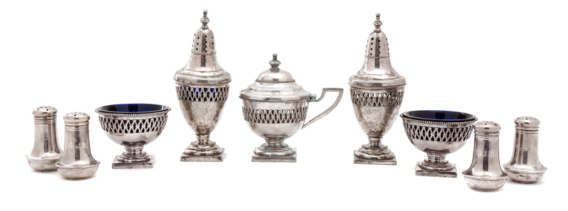 comprising 4 sterling shakers, 2 silver plated standing peppers, and 2 silver plated open salts with cobalt glass liners, together with a condiment bowl missing liner.