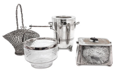 comprising 1 etched crystal silver mounted bowl with pierced cover, 1 James Shaw and Fisher box with cover and lift handle, 1 covered wine cooler, and 1 silvered wire basket.