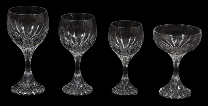 Massena pattern, comprising 12 stemmed water goblets, 12 claret wines, 12 champagne coupes and 12 bordeaux wines, 48 items total.