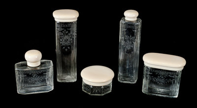 A Group of Five Etched and Cut Glass Dresser Set
