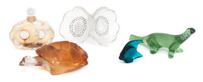 comprising a green glass Salamander, amber glass Tortue Caroline, teal glass fish, Two Flower perfume bottle, and Anemone flower paperweight.