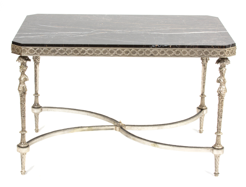 A Neoclassical Style Silvered Metal Black Marble Top Coffee Table