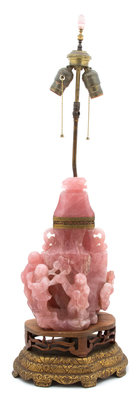 A Chinese Carved Rose Quartz Figural Urn Mounted As Lamp